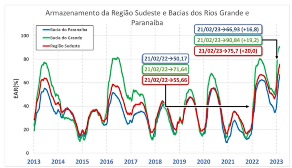 A geração hídrica no Sudeste em fevereiro apresentou aumento na comparação com os meses anteriores, mas a bacia do Paranaíba é a única que vem apresentando queda na produção. Em novembro, eram 3.929 MW med e em fevereiro, a produção deve ficar em 1.997 MW med. Mesmo assim, o armazenamento no dia 21 de fevereiro era de 66,93%, 16,8 pontos percentuais a mais que no mesmo dia de 2022, quando o nível era de 20,17%.